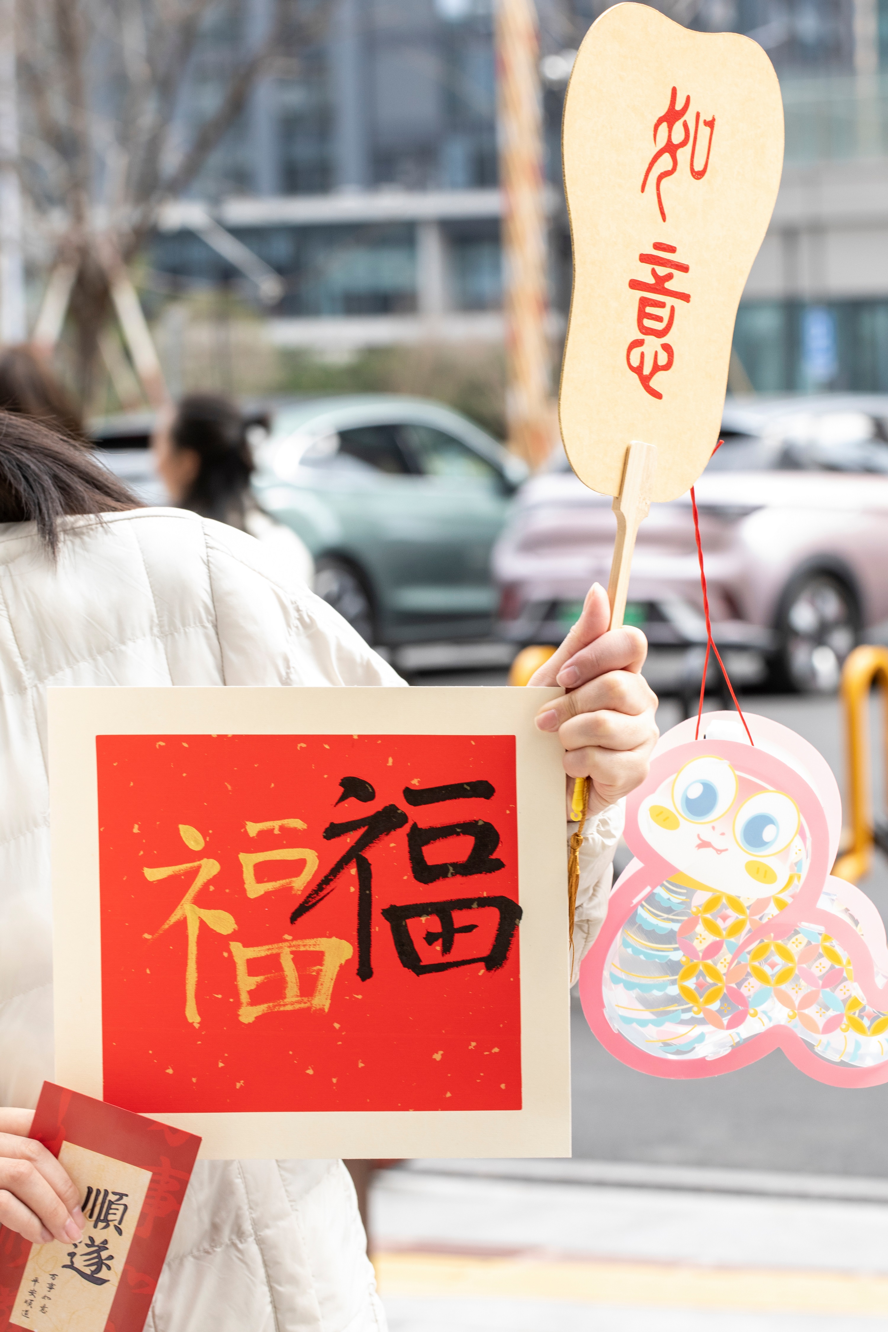出门来到1F培训室,还可以继续体验剪窗花、写福字、做灯笼。窗花摊位上有各种可爱又难度不一的剪纸,配有剪刀、胶水、刻刀,耐心完成后把窗花粘在背景板上,给今年家里过年增添一件装饰品;写福字时,有循规蹈矩写“福”的,有发挥创意,又写又画,把蛇形与福字相结合,也有挥毫泼墨,一展风采,引得众人惊叹连连;灯笼摊位上可不止能做灯笼,中国结、福字、柿子、扭扭蛇,甚至是薯条,都能在大家的集思广益下完成。